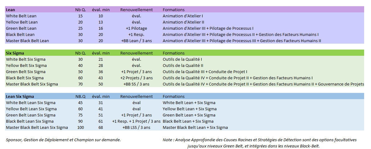 Certains organismes de formation déclinent d'ailleurs une multitude de variantes liées à l'historique de la démarche, que ce soit avec du Six Sigma seul, ou différentes spécialisations du LEAN (médical, office, IT, manufacturing, etc.) rendant l'offre finalement complexe pour celui qui souhaite découvrir ou se lancer dans la démarche simplement et à moindre frais s'il voulait changer de domaine d'activité. Mais d'un autre coté, ils répondent également à un besoin de spécialisation exprimé par leurs clients qui sont dans ces domaines spécifiques.